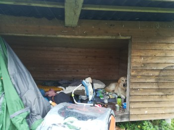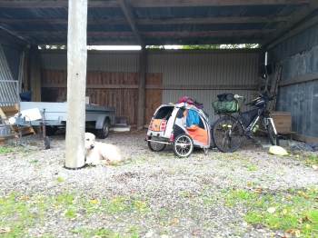 Nach ein paar Minuten kam wohl der Besitzer nach Hause und schien sichtlich verdutzt mich zu sehen. Mit seinem kleinen Sohn Björk auf dem Arm und der etwas größeren, aber immer noch kleinen Sue neben sich, kam er über den Rasen zu uns rüber geschlendert. Während Woody seiner Katze hinterherflitzte, die er aber nicht erwischte und mit Sicherheit nur mal eben beschnuppern wollte, fragte er mich, was ich hier tun würde. Ich erzählte ihm, dass ich diesen Shelter über meine App gefunden habe und fragte ihn, ob das nicht korrekt wäre. Kurz und knapp: in der Beschreibung des Shelters stand, dass man sich vorher anmelden müsse, da es sich eben um einen privaten Unterschlupf handelt. Das habe ich wohl überlesen und war natürlich peinlich berührt. Er erlaubte uns dennoch die Nacht über in seinem Garten zu bleiben und zeigte mir alles. Der Hund muss aber angeleint bleiben!, fügte er am Ende hinzu, was ich natürlich einwilligte. Schade für Woody, aber bevor wir wieder abhauen müssen…