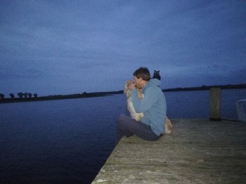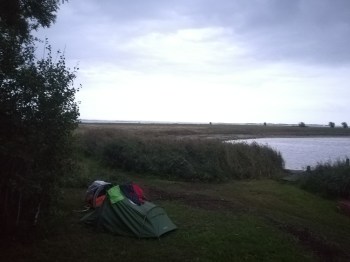 Am Ende eines Weges, der auf ein Privatgrundstück mündete, fanden wir einen kleinen Bootsanlegeplatz mit Bänken und tollem Ausblick. Ein bisschen Risiko gehört eben dazu!, dachte ich mir und verstaute alles im schnell aufgebauten Zelt. Bei unserer Ankunft hatte es natürlich wieder aufgehört zu Regnen. Karma? Da ich mir kein neues Wasser besorgt und nur noch ca. 2 Liter für Woody und mich hatte, beschloss ich mir ein paar Brote zu schmieren. Wir saßen noch etwas am Steg, lauschten dem Wind durch das hohe Gras pfeifen zu und genossen den Augenblick. Um 20:00 Uhr dann war ich so müde, dass ich die Flasche Wein, die ich zuvor gekauft hatte, nicht mehr öffnen wollte, sondern direkt mit Woody ins Zelt ging. Mir war natürlich klar, dass es an diesem Ort nur vor Mücken sow immeln musste. Daher hatte ich prompt meine Mückenarmbänder ausgepackt, die ihre Sache gar nicht so schlecht machten. Nur drei Stiche konnte ich während des Abends zählen, was bis zum nächsten Morgen nicht mehr werden sollte.