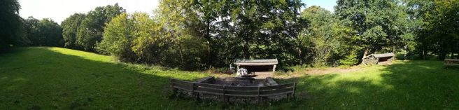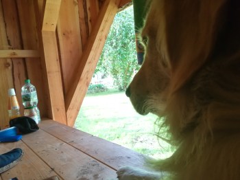 Nachdem ich Woody geweckt und alles wieder verpackt hatte, machten wir uns auf den Weg. Leider setzte kurz nach dem Aufbruch der Regen ein, der nur auf uns gewartet zu haben schien. Bis zu unserer Ankunft am besagten Platz, lies er einfach nicht locker. Kaum waren wir jedoch angekommen, lies die Sonne sich natürlich nochmal blicken. Pünktlich zum Aufbauen und Verstauen sozusagen. Es sollte die erste Übernachtung für uns in einem richtigen „Shelter“ werden und somit war auch Woody anzumerken, dass er sichtlich aufgeregt und verdutzt über dieses neue Holzzelt war. Um uns gegen Regen, Wind und Kälte etwas zu schützen, spannte ich das Zelt vor die Öffnung, was gleichzeitig dazu diente, das Zelt etwas trocknen und lüften zu lassen. Den weiteren Abend über habe ich sehr viel an meinem ersten Beitrag über die Tour geschrieben und natürlich mit Woody geschmust. Insgesamt hatten wir anschließend eine angenehme, wenn auch nicht ganz so warme Nacht und waren gespannt auf den morgigen Tag.