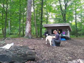 Nur wenige Minuten später kam ein Mann mit einem Lastenrad vorbei, wurde von Woody bellend und schwanzwedelnd begrüßt und fing an die beiden anderen Shelter etwas zu putzen und zu beladen. Hey! Gleich kommen noch ein Hund und ein paar Jugendliche, so 11, 12 Jahre alt, teilte er mir mit. Wir unterhielten uns ein bisschen und er kam noch bestimmt vier oder fünf mal wieder her um weiteres Equipment zu bringen. Er fragte mich, ob ich mit zum Supermarkt kommen wolle, welches ich jedoch verneinte, da ich Woody zum einen nicht so lange alleine lassen und zum anderen ihm aber auch keine 7-8 Kilometer lange Strecke je Weg zumuten wollte. Ich bat ihn jedoch mir Tomatensauce und Kaffeepulver mitzubringen, was er gerne tun wollte. Als er dann Weg war, bemerkte ich, dass ich mich sehr auf den Abend freute und äußerst gespannt war. Ich wandte mich Woody zu: Menschen! Richtige Menschen zum Unterhalten! Und Kinder, die dich sicher die ganze Zeit lang streicheln werden! Und ein Hund, den du bestimmt toll finden wirst! Nachdem er wieder weg war schnappte ich mir das Rad und fuhr mit Woody Wasser holen. Auf wem Weg zurück fragte ich den Förster, ob ich auch meine andere Powerbank laden könne. Klar! Die Rote Scheune, weißt ja wo! Zurück am Platz, fing ich an meine Gedanken über Woody aufzuschreiben. Entstanden ist mein Blogbeitrag Ein Brief von Woodstock.