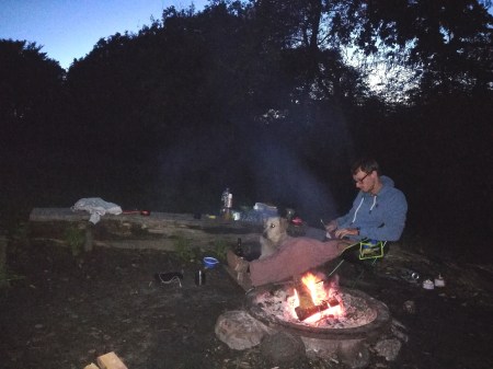 Nachdem ich mich etwas mit Jürgen unterhalten & seine Fragen beantwortet habe, wollte ich etwas zu Essen machen. Diesmal allerdings mit einem Feuerchen! Holz hatte ich zuvor ja schon geholt, sodass ich es nur noch anbekommen musste. Als Zündstoff mussten einige Seiten meines Notizbuches herhalten, welches ich bisher eh noch nicht benutzt hatte. Insgesamt zwei Mal kochte ich mir Nudeln mit Thunfisch, Tomatensauce & Käse, solch einen Hunger hatte ich und auch Woody schien hungrig gewesen zu sein. Als es anschließend etwas kühler wurde, beschloss ich meine gemütliche Hose anzuziehen, das Feuer etwas größer zu machen und mir einen Becher Wein zu gönnen. Dafür, dass es der günstigste war, der mir ins Auge fiel, schmeckte er ziemlich gut. Allerdings kann man den Geschmack von Wein auch nicht am Preis messen, finde ich. Während Woody entspannt auf seiner Decke lag, trabten und galopierten ein paar Pferde auf der Koppel hinter den Büschen hin und her, sodass Woody sich wohl immer wieder fragte, woher denn diese komischen Geräusche kommen mögen. Indessen habe ich etwas in die Tasten gehauen, um den Beitrag über die 2. Etappe zu Schreiben und die Sorgen ein wenig vergessen können. Es war einer der wenigen Momente bisher, in denen ich wirklich entspannt war. Noch bis 22 Uhr saßen & lagen wir am Lagerfeuer, tranken Wasser & Wein und entspannten uns ein wenig von den zuletzt etwas verregneten und stressigen Tagen.