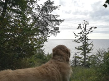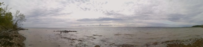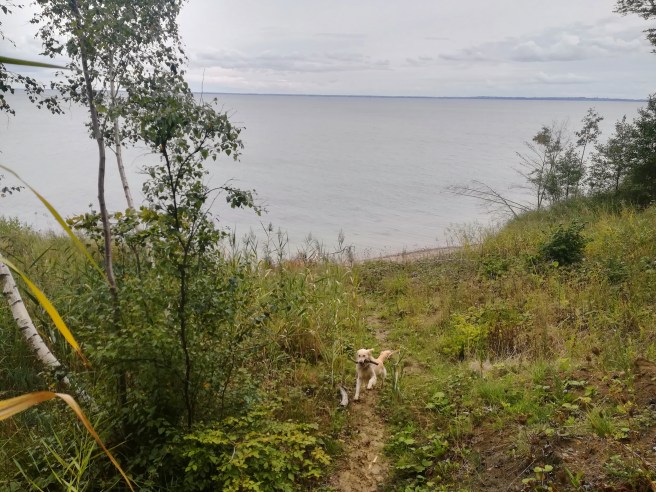 Dort angekommen machte ich mir erneut einen Kaffee, lauschte der etwas unruhigen See und lies Woody ein wenig schnüffeln & streunern, ganz ohne Leine. Neben dutzenden von Fotos, liefen wir auch den Strand ein wenig entlang und erkundeten die Küste. Nach einer Stunde fing es leider etwas zu regnen an, sodass wir uns wieder zu unserem Shelter aufmachten. Oben angekommen hörte es natürlich sofort wieder auf. Nun müssen wir jedoch etwas an später denken, sprach ich zu Woody, der keine Ahnung zu haben schien, wovon ich da eigentlich rede. Wasser und Feuerholz, waren gemeint! Ich leerte den Rucksack, schnappte mir das Fahrrad und fuhr mit Woody an der Leine zur nahegelegenen Toilette, direkt neben des Försters Häuschen um meine Wasservorräte aufzufüllen. Da der Feuerholzvorrat dieses Shelters nichts mehr hergab, beschloss ich zuerst das Wasser zurückzubringen und mit leerem Rucksack zum alten Platz zu fahren. Dessen Vorrat war nämlich bis zum Bersten gefüllt! Der Tag & Abend war somit gerettet.