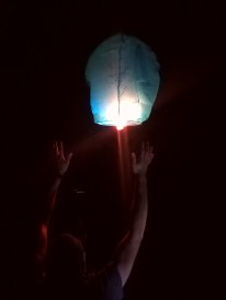 Woody hatte nun seit über 3 Stunden an Nello gehangen und einfach nicht locker gelassen. Ich konnte mir ein lachen nicht verkneifen, schickte Woody aber ab auf die Decke! in den Shelter. Irre dieser Hund! Irre toll! Nachdem die Jungs & Mädchen ebenfalls den ein oder anderen Marshmallow verdrückt hatten, war es reif für das letzte Event!, wie Line es nannte. Sie planten ein paar mit Kerzen befeuerte Luftballons steigen zu lassen. Insbesondere heute Nacht war es sternenklar und relativ windstill – perfekt also für ein paar fliegende Lichter! Die Jugendlichen waren begeistert. Den blauen Ballon konnte man mehrere Minuten fliegen und immer kleiner werden sehen. Der rote war nach kurzer Zeit hinter der Waldwand aus Bäumen verschwunden. Einen dritten gab es auch noch, jedoch hatte der grüne Ballon keine Lust aufzusteigen und fiel die Klippe hinunter. Eines der Mädchen hatte sehr gut aufgepasst und direkt die Flasche Wasser gezückt um das drohende Feuer zu löschen. Nicht schlecht!