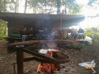 An unserem Übernachtungsplatz angekommen, machte ich mich direkt daran Platti zu fixen. In der Tat war in dem Reifenmantel ein klitzekleiner Splitter, der immer wieder neue Löcher in den Schlauch gepiekst hatte. Anschließend packte ich unsere Sachen zusammen und wir brachen zum 2-3 Kilometer entfernten Shelter auf. Auf dem Weg dorthin fragte ich an dem einzigen Häuschen, die dem Förster zu gehören schien, ob ich dort meine Powerbank laden könne. Klar! Da drüben im roten Schuppen! Genial! Somit wäre mein Stromproblem für die nächsten Tage erstmal gelöst. Kaum waren wir am neuen Platz angekommen, puhlte ich direkt drei Zecken von Woody ab, die auf ihm rumkrabbelten. Das sollten nicht die letzten gewesen sein, wie ich im Laufe des Wochenendes feststellen sollte.