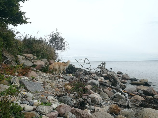 An diesem Morgen, sind wir das erste mal spazieren gegangen. Sonst waren es ja eher Schnüffelrunden um den ein oder anderen Shelter, die Woody alleine unternommen hat. Da wir aber nun etwas zur Ruhe kommen wollten und ich ihm etwas Erholung versprochen hatte, gingen wir ein wenig durch den naheliegenden Wald, an der steilen Küste im Osten des Landzipfels bei Trelde Naes entlang. Diese und viele weitere tolle Fotos sind dort während der morgendlichen Kleinwanderung entstanden. Ganz anders als es diesem Moment, jetzt gerade, während ich diese Zeilen, an meinem Shelter in Enslev, geschützt vor Sturm und Regen schreibe. Nach einigen weiteren Kilometern entdeckten wir einen weiteren Shelterplatz. Hierhin ziehen wir gleich um!, sagte ich zu Woody, der mir, wie so häufig hechelnd, lächelnd zuzustimmen schien.