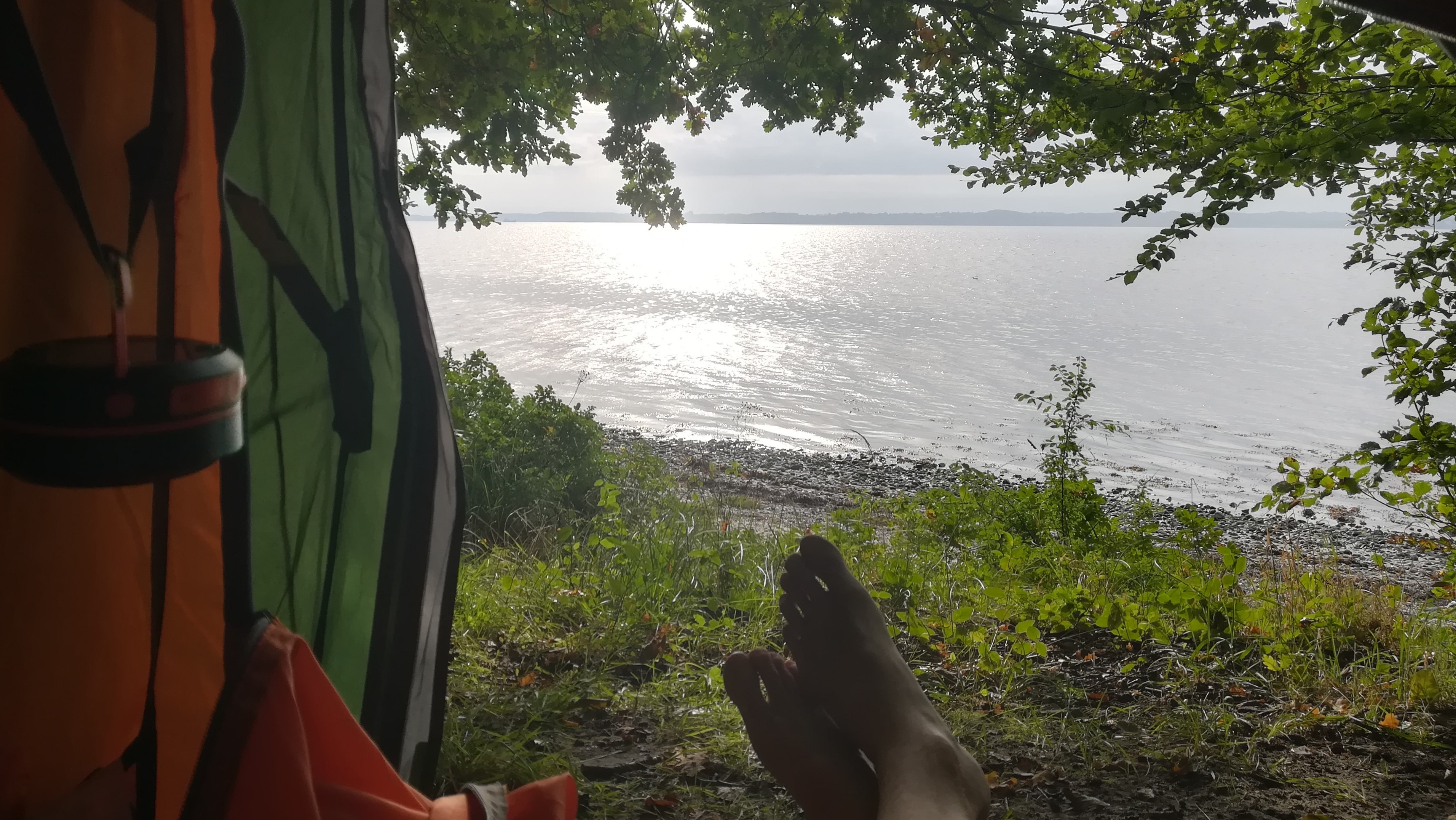 Jeder der Plätze am Meer, an denen wir übernachtet haben, hatte seine Feinheiten. Unser erster Shelter beispielsweise war eine einfache, kleine Stelle im Wald kurz hinter Apenrade, ohne Schnickschnack: Eine Feuerstelle und etwas Platz für das Zelt – mehr gab es nicht, außer dem Atemberaubenden Blick aufs Wasser.