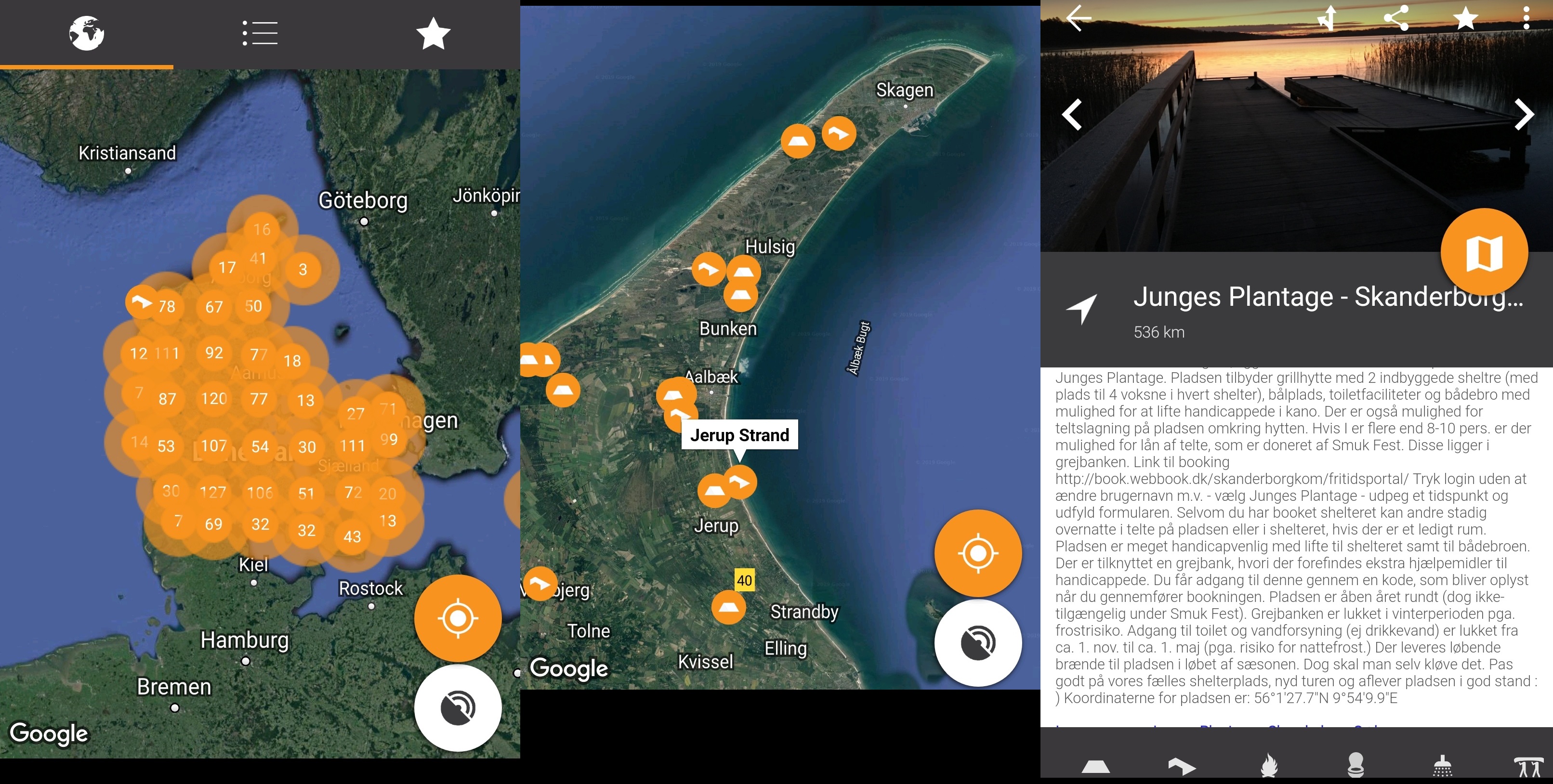 Zu Anfang unserer Tour, war mir noch nicht bewusst, dass es hierfür sogar eine App gibt, die alle Shelter Jütlands mit – mal mehr oder weniger – Informationen aufzeigt. Sie heißt Shelter und ist kostenlos im App-Store erhältlich. Auf der Hauptkarte kann man dann entsprechend zum Ort zoomen, den man sich anzeigen möchte, oder seinen aktuellen Standort benutzen, um nahe liegende Shelter zu entdecken. Die beiden verschiedenen Symbole auf der Hauptkarte zeigen direkt an, ob es sich um einen einfachen Zeltplatz oder eine Holzhütte handelt. Die Seiten der einzelnen Shelter haben dann Informationen zu den Plätzen selbst. Die Symbole unten auf den Shelter-Seiten zeigen an, was man dort erwarten kann, wobei man dies nicht unbedingt für Bare Münze nehmen sollte. Manchmal sind dort auch Bilder der einzelnen Spots hochgeladen, sodass man sich vorab schon ein Bild machen kann. Die schriftlichen Informationen sind meist auf Dänisch, was das Verständnis für Nicht-Dänen etwas erschwert. Auf der anderen Seite macht es natürlich auch den Entdeckungscharakter aus: nicht genau zu Wissen, was man an dem Shelter erwarten kann.