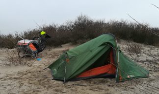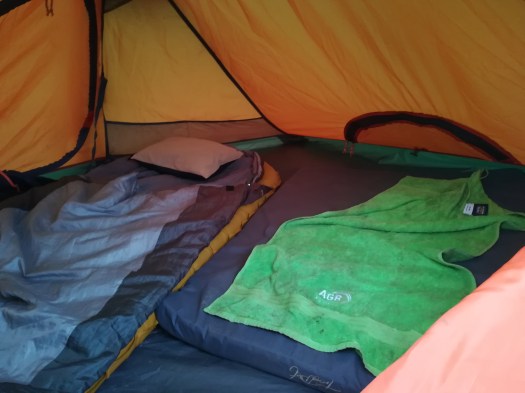 Schwieriger war die Entscheidung, welche essentiellen Komfort-Artikel ich erstehen und mitnehmen wolle. In einigen Bike(-packing) Facbook-Gruppen habe ich mich also an die Mitglieder gewand und nach einem geeigneten Zelt, sowie einer angenehmen Matratze gefragt. Die Reaktionen waren natürlich sehr unterschiedlich, sodass ich einige Tage damit verbringen musste, mir die Vorschläge genauer anzusehen und Rezensionen, sowie Daten auszuwerten & zu vergleichen. Am Ende hatte ich mich dann für das Zelt von Vango – Banshee 300 – und die Matratze von Therm-A-rest – Neo Air X Lite – entschieden. Gute Entscheidung! Das Zelt war nach etwas Übung sehr schnell auf- und abgebaut & auf der Matratze lies es sich hervorragend schlafen.